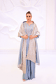 A stunning red gown featuring intricate silver and golden embroidery, delicately adorned with bird motifs at the hem, paired with a matching gharara for a complete, regal ensemble. The detailed embroidery and graceful silhouette exude opulence and elegance, making it a perfect choice for weddings, festive events, or grand celebrations. Every element of this outfit reflects luxury, craftsmanship, and contemporary royal charm.