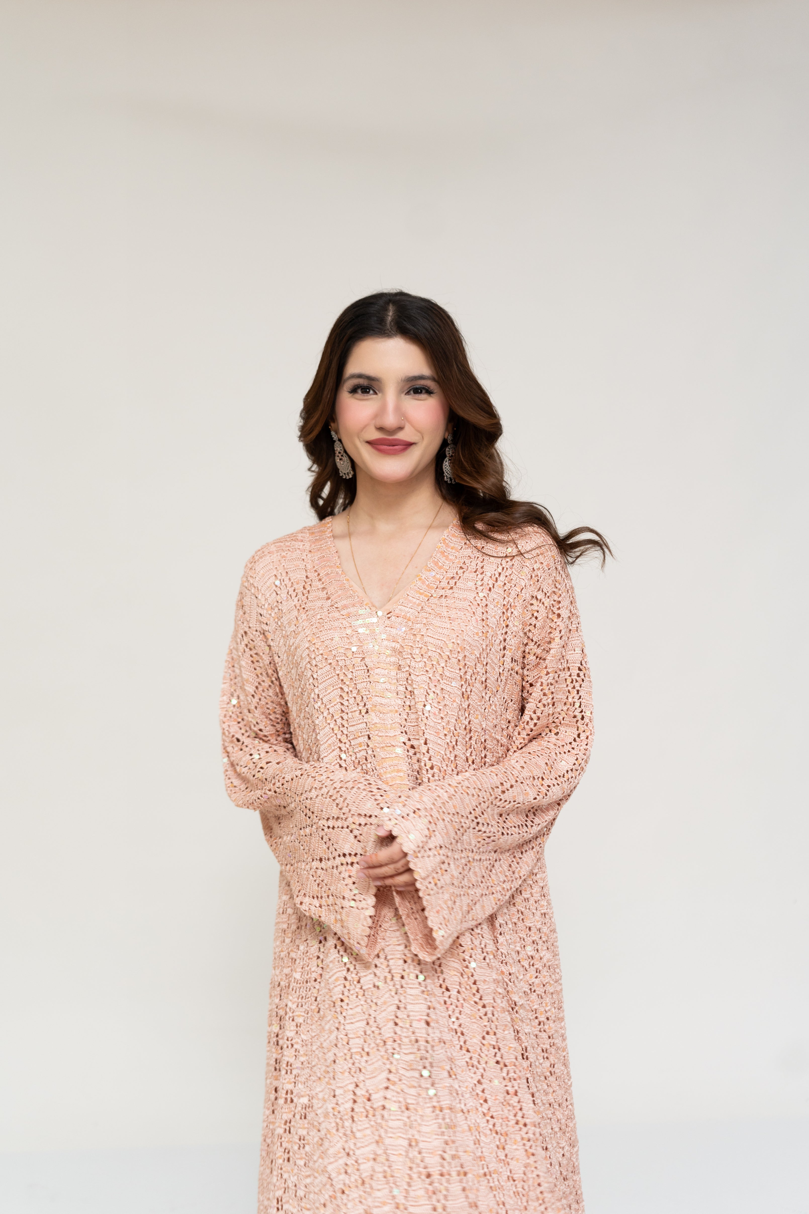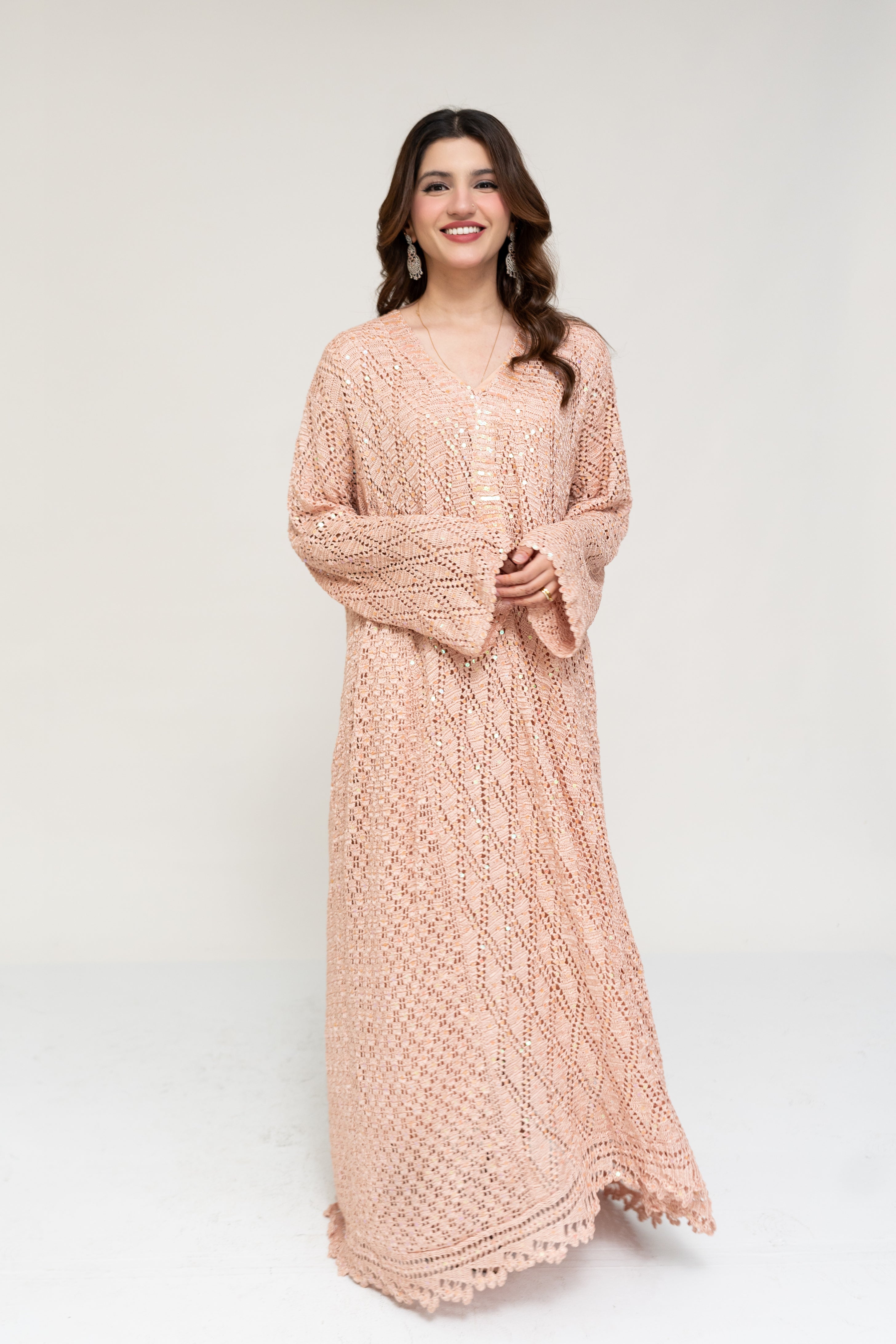 Crafted in a soft blush/peach hue, the dress features an intricate open-knit crochet pattern that creates a beautifully textured surface while remaining lightweight and breathable. The elegant V-neckline enhances the feminine silhouette, while the flowing maxi length adds graceful movement with every step.