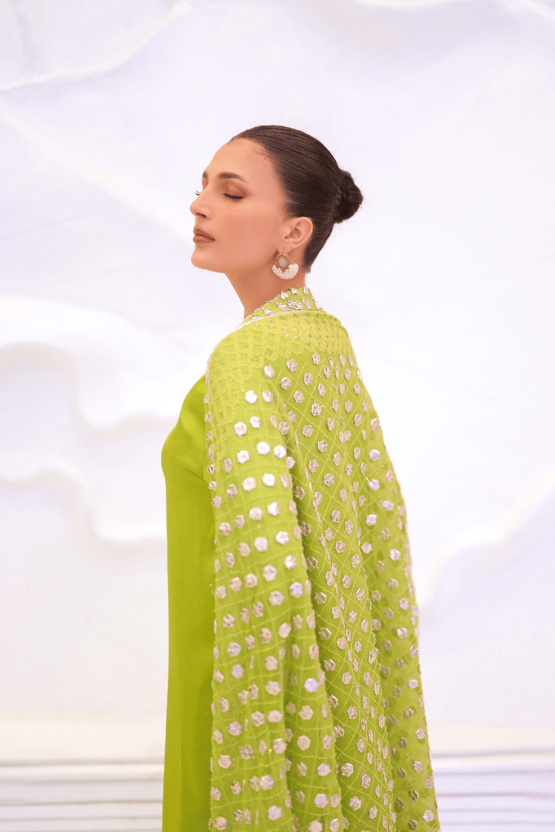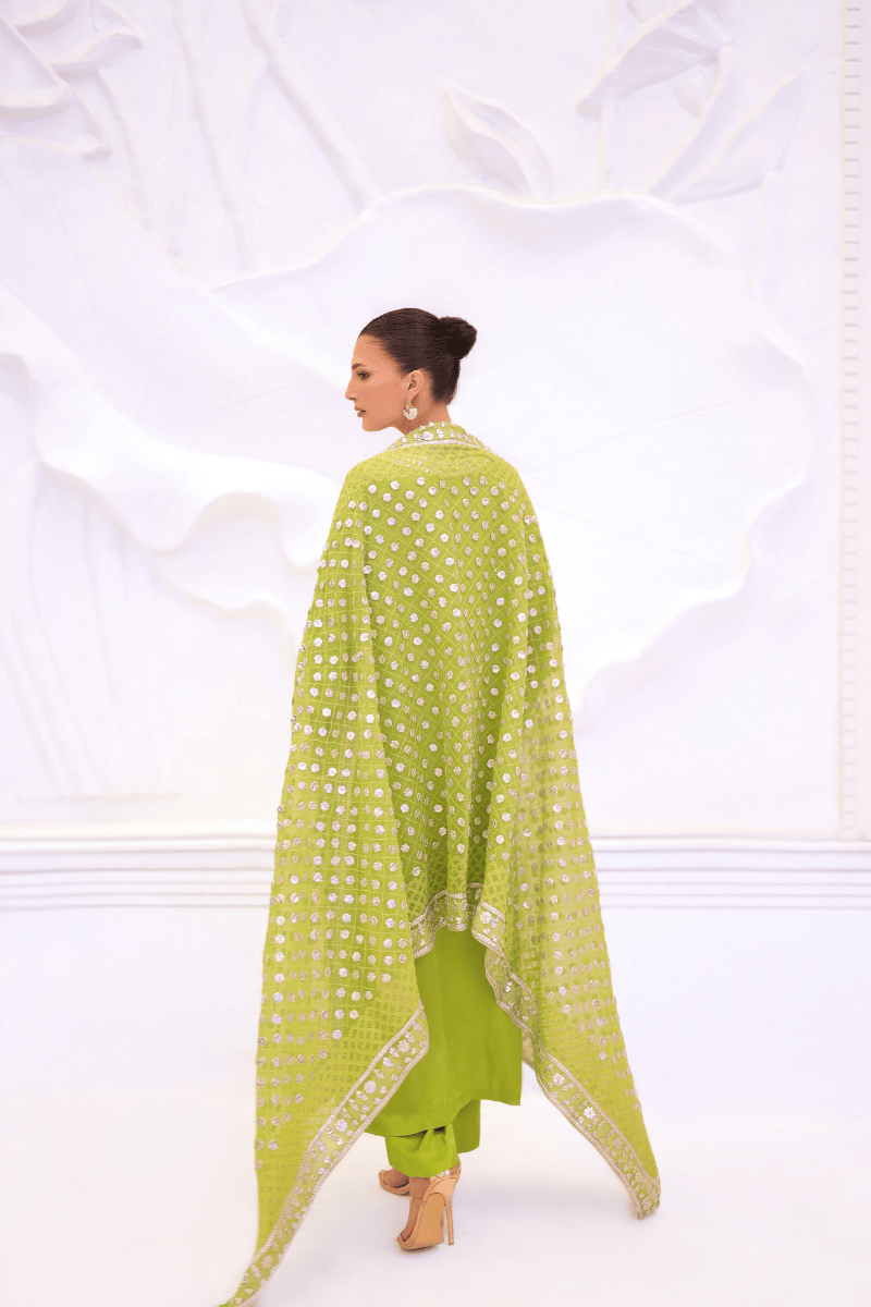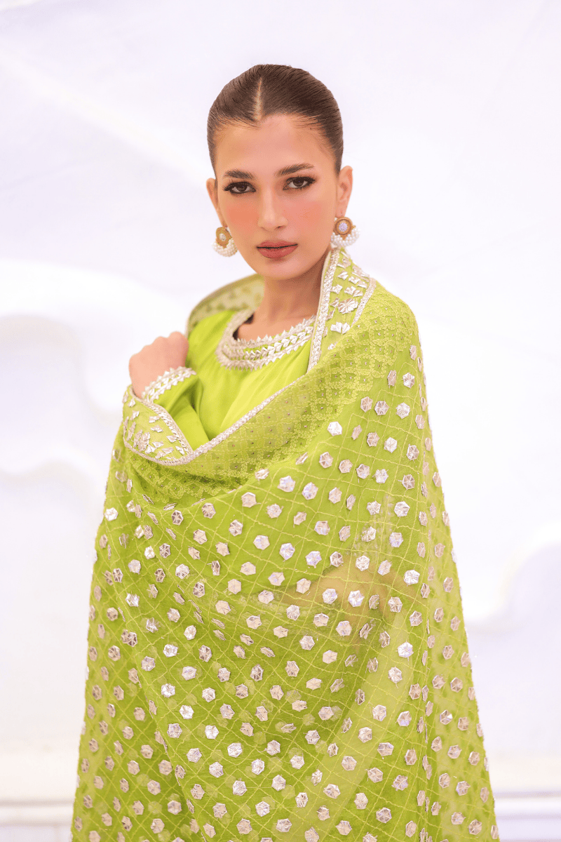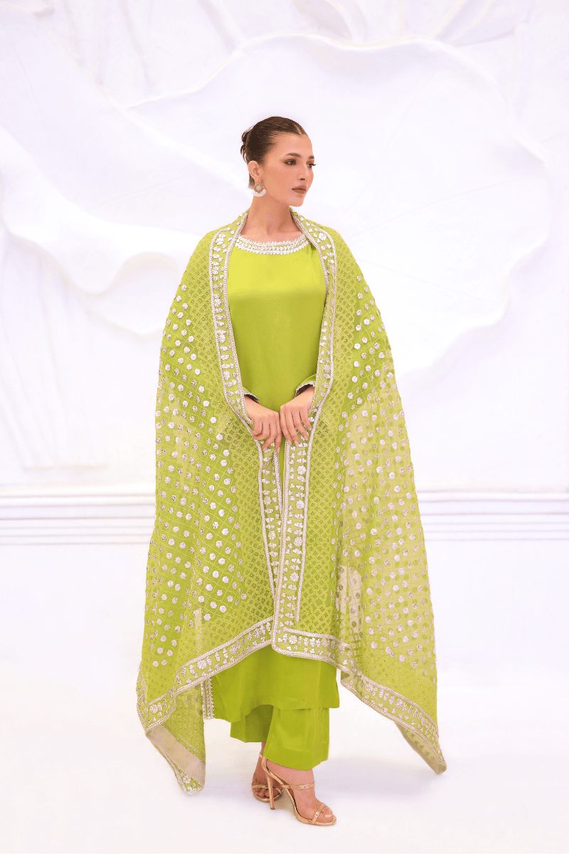 A vibrant lime silk kurta paired with matching trousers, elevated by a heavily embellished Gota work dupatta. The rich silk fabric drapes gracefully, while the intricate Gota detailing adds a luxurious shimmer, making this ensemble perfect for festive occasions, weddings, or celebratory gatherings. The bright lime hue exudes confidence and elegance, ensuring a standout, regal presence.