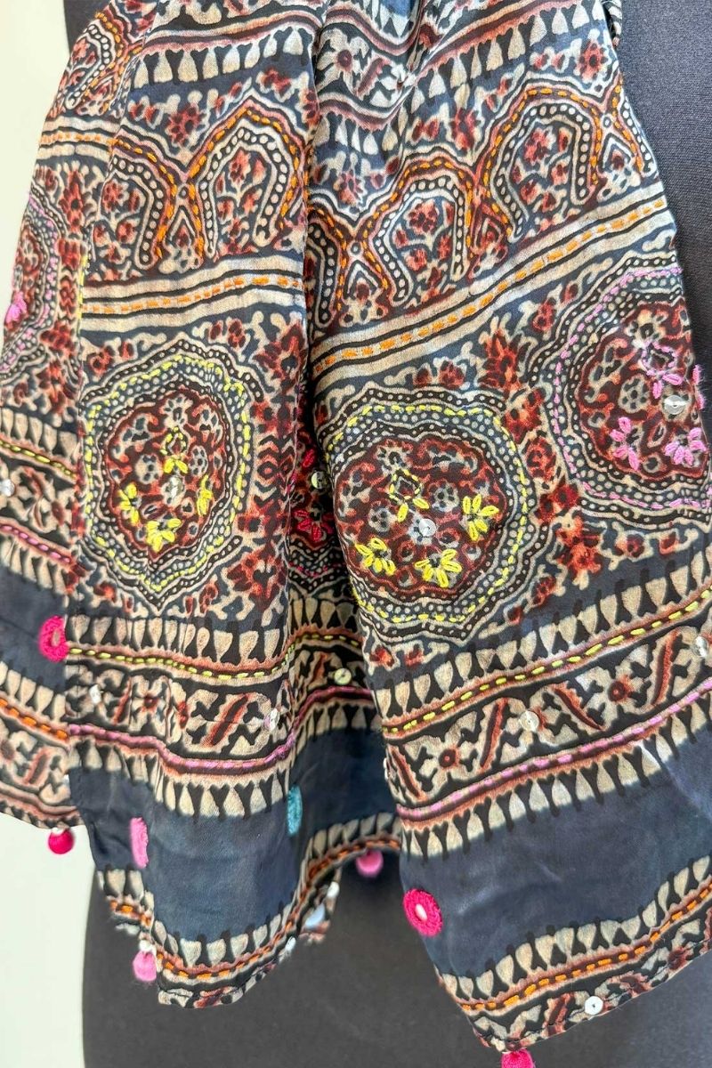Traditional Ajrak scarf hand block printed with natural dyes combining with hand embroidery. Product is handcrafted and chemical free, 100% organic.