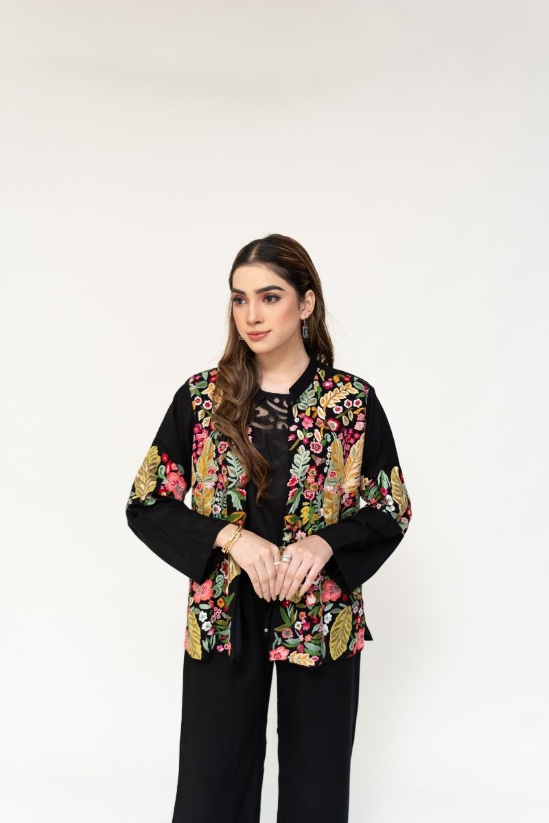 This jacket showcases exquisite satin stitch embroidery and delicate shadow work—two traditional embroidery techniques—brought to life in a fresh, contemporary style. Each motif is crafted by skilled women artisans—reflecting hours of dedication, precision, and artistry.
