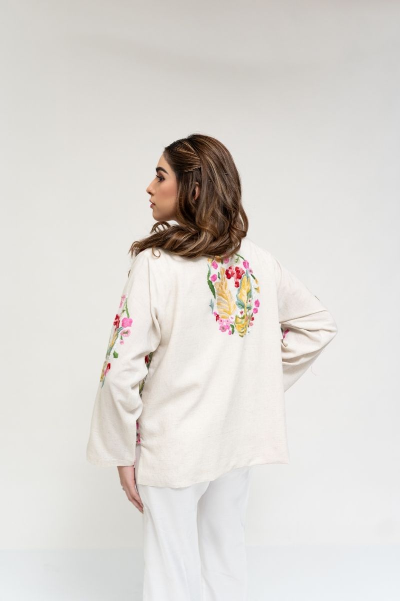 This jacket showcases exquisite satin stitch embroidery and delicate shadow work—two traditional embroidery techniques—brought to life in a fresh, contemporary style. Each motif is crafted by skilled women artisans—reflecting hours of dedication, precision, and artistry.